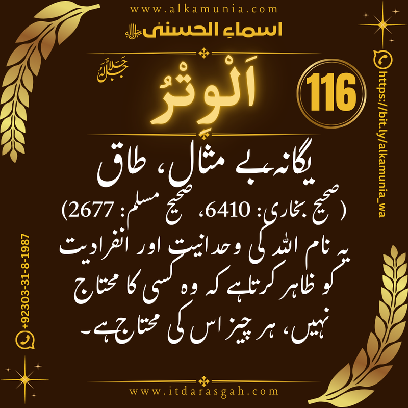 جو بندہ "اَلْوِتْرُ" پر یقین رکھتا ہے، وہ جان لیتا ہے کہ اللہ کے سوا کوئی کارساز نہیں۔