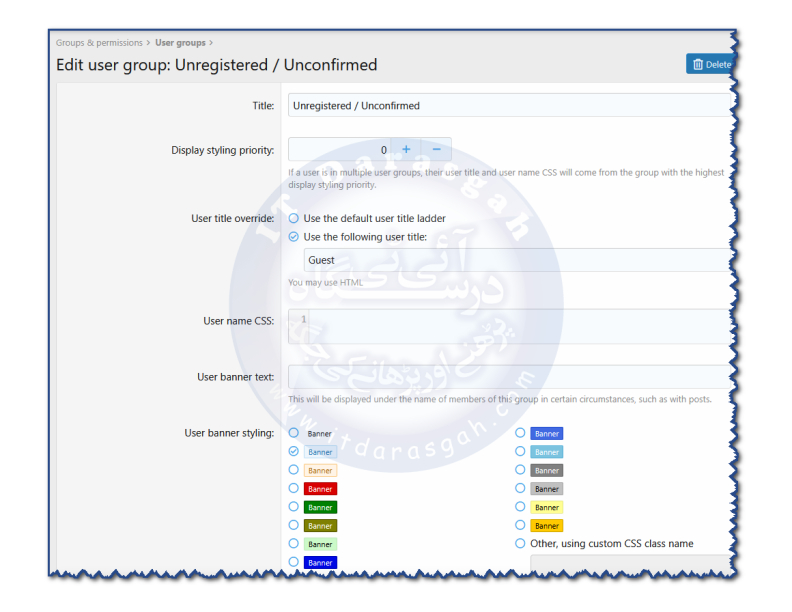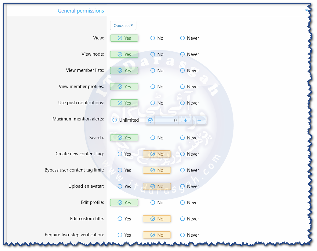 ایڈمن پینل → یوزرز → یوزر گروپس → "Permissions"رجسٹرڈ ممبران کے لیے بنیادی پرمیشنز: