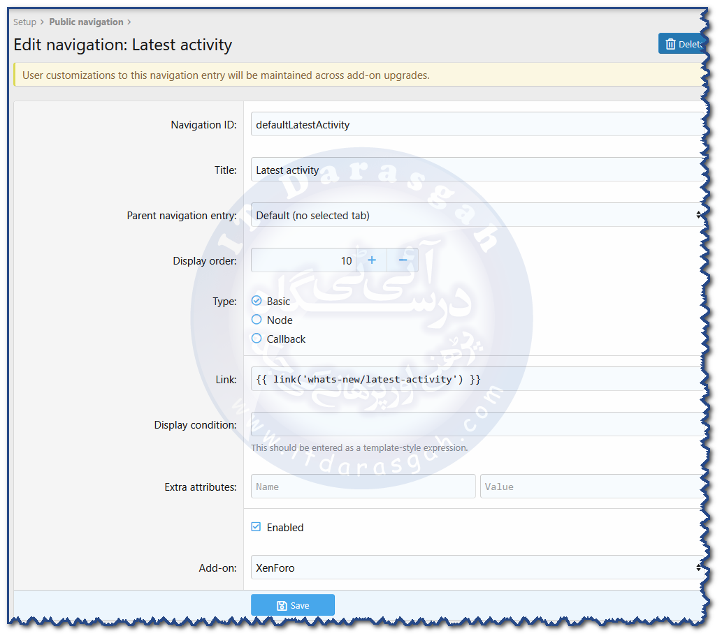 نیویگیشن → "Add navigation entry"نیویگیشن انٹری ڈیٹیلز: