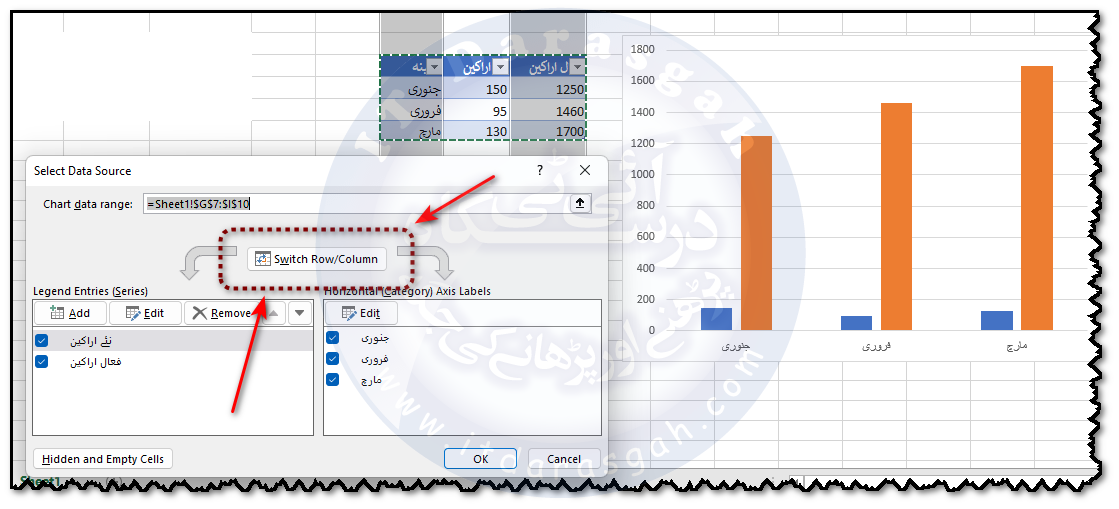 چارٹ پر دائیں کلک کریں اور "ڈیٹا کا انتخاب..." منتخب کریں۔ نیچے "قطار/کالم بدلیں" بٹن پر کلک کریں۔ دیکھیں کہ چارٹ کی سمت کیسے بدل جاتی ہے۔