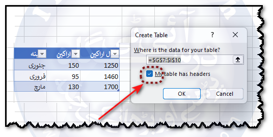 ایک ڈائیلاگ باکس ظاہر ہوگا، "میرے ٹیبل میں ہیڈرز ہیں" والا خانہ چیک ہونا چاہیے۔ OK دبائیں۔