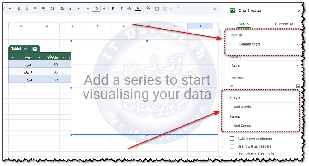 چارٹ میں ترمیم: کیا میں چارٹ کا عنوان تبدیل کر سکتا ہوں اور یہ سمجھتا ہوں کہ ایکسل میں "قطار/کالم بدلیں" اور شیٹس میں X-axis/سیریز بدلنا چارٹ کی سمت کیسے بدلتا ہے؟